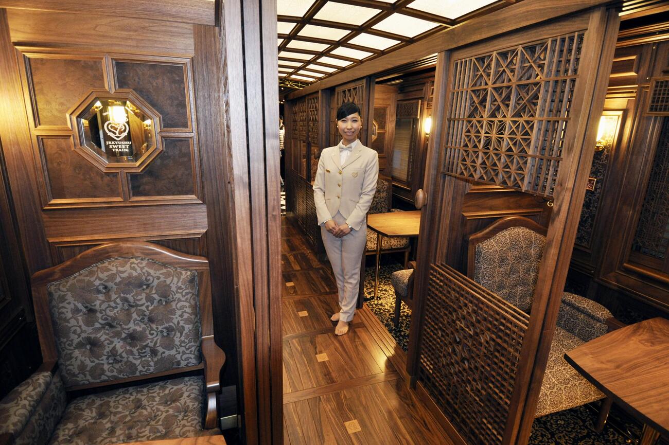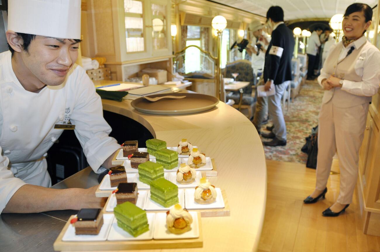 Aru Ressha isn’t just a train, it’s a journey back in time. Designed by Eiji Mitooka, this two-car train feels like stepping into a classic, royal-style carriage. It’s also known as the “Sweet Train,” because instead of a simple bento, you’ll enjoy a seasonal multi-course menu created by Michelin-starred Chef Yoshihiro Narisawa, served to you one dish at a time.
