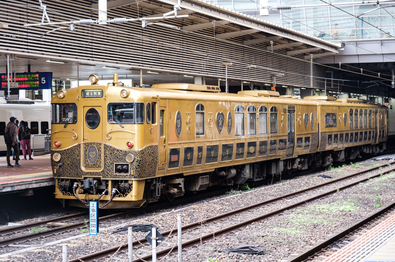 Your journey begins here in Hakata, the main starting and ending point of the Aru Ressha. From here, the train travels along the scenic Kyudai Main Line to Yufuin (or vice versa), so sit back and relax as you watch the changing landscapes of mountains, rivers, and charming rural towns through large windows. It’s a slow, beautiful three-hour ride, meant to be savoured, not rushed.