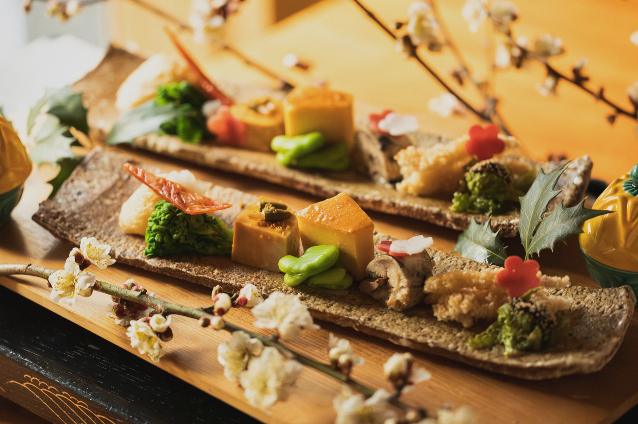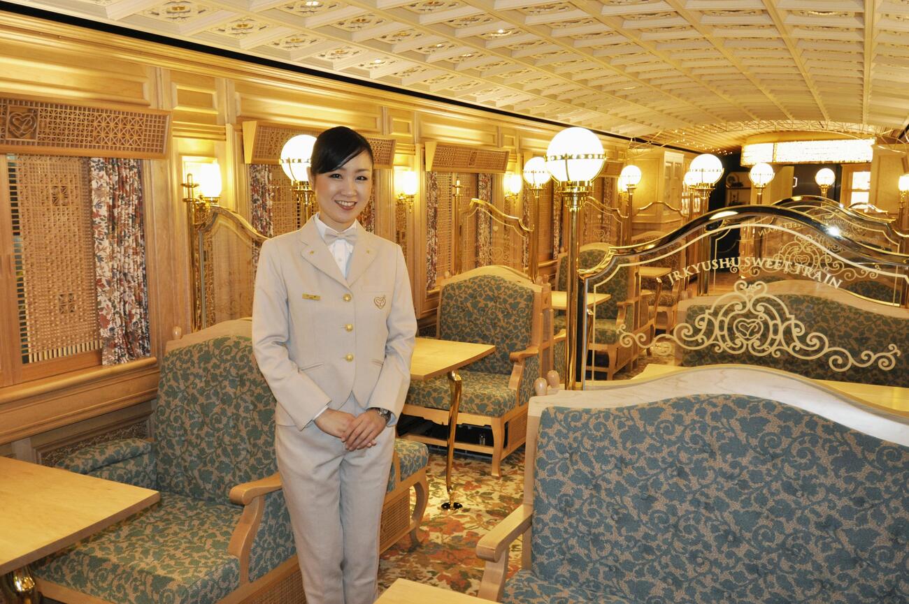 Often called the “Sweet Train”, the highlight of the journey is the multi-course dining experience created by Chef Yoshihiro Narisawa, a Michelin-starred chef known worldwide. Here, instead of a bento box, you’ll be served a full-course meal, dish by dish, right at your seat — just like in a fine dining restaurant. The menu changes seasonally, using fresh ingredients from all over Kyushu, and the dishes are served on handcrafted tableware made by local artisans, with free-flow drinks including champagne, plum wine, tea, and more.