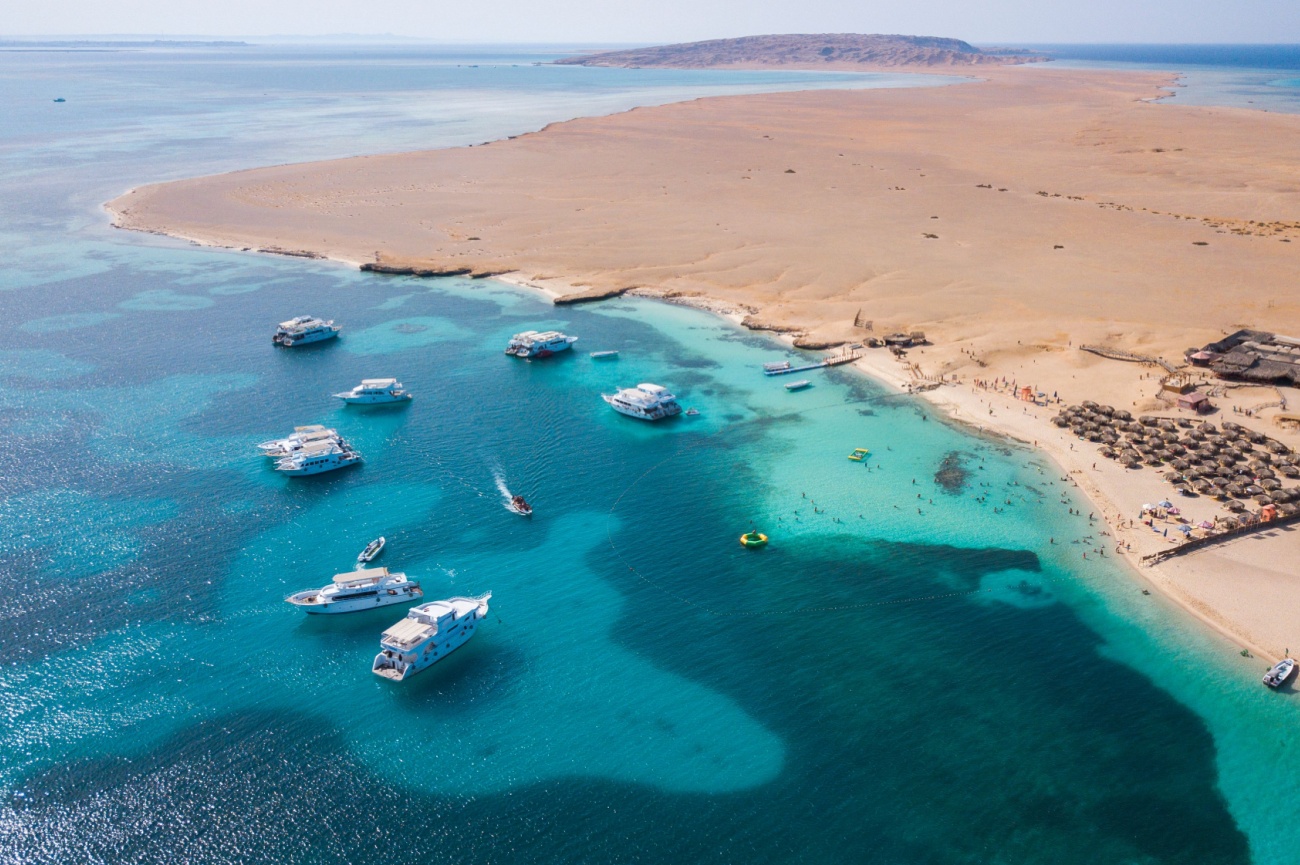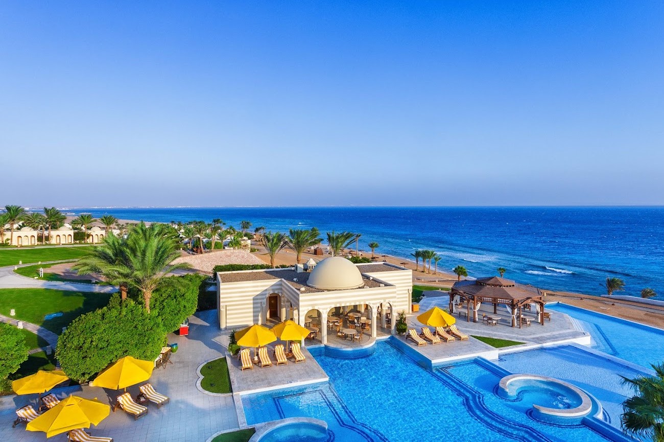 Travel to Hurghada, a Red Sea paradise known for its luxurious resorts and vibrant underwater ecosystems. Check into your premier beachfront hotel: The Oberoi Beach Resort - Renowned for its exceptional service and elegant design, this exclusive retreat offers spacious suites and villas with private pools and lush gardens.