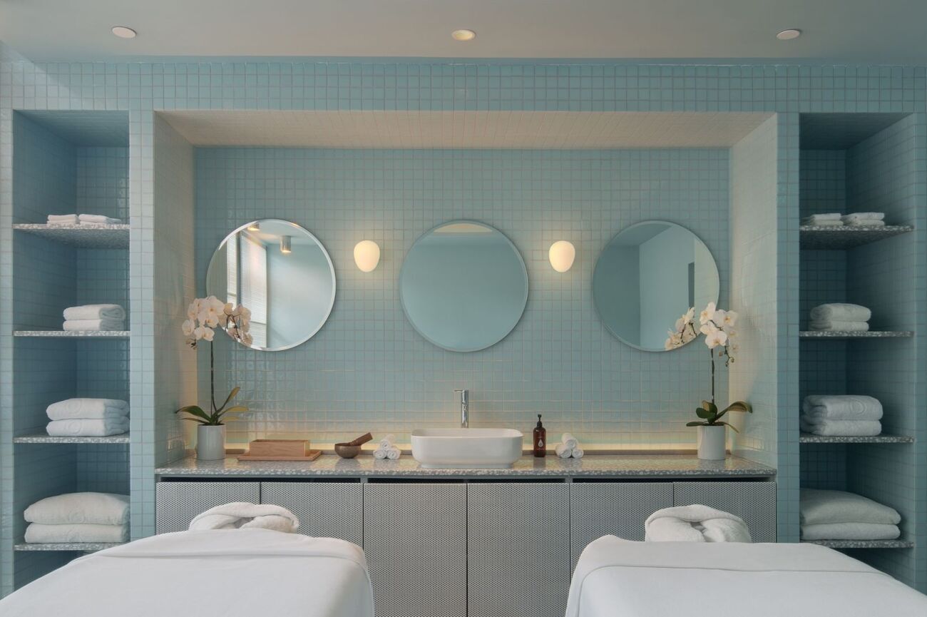 The design, created by Paola Navone of OTTO Studio Milano, is calm, symmetrical, and intentionally restrained, with interiors shaped around the visual language of water. The atmosphere feels more like a dedicated wellness club than a hotel spa, which is exactly the point.
