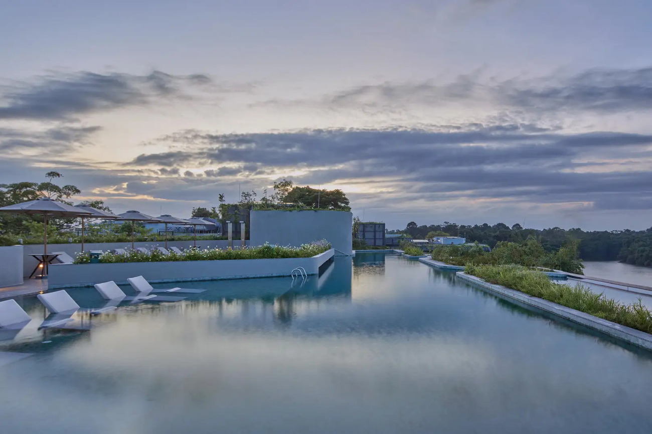 Dining continues the nature-focused theme. Forage, the resort’s signature restaurant, overlooks the Upper Seletar Reservoir and offers a “Trust the Chef” menu built around seasonal ingredients, including produce grown in the resort’s rooftop edible garden. Planter’s Shed serves breakfast and all-day dining with live cooking stations and menus that emphasise sustainable sourcing.