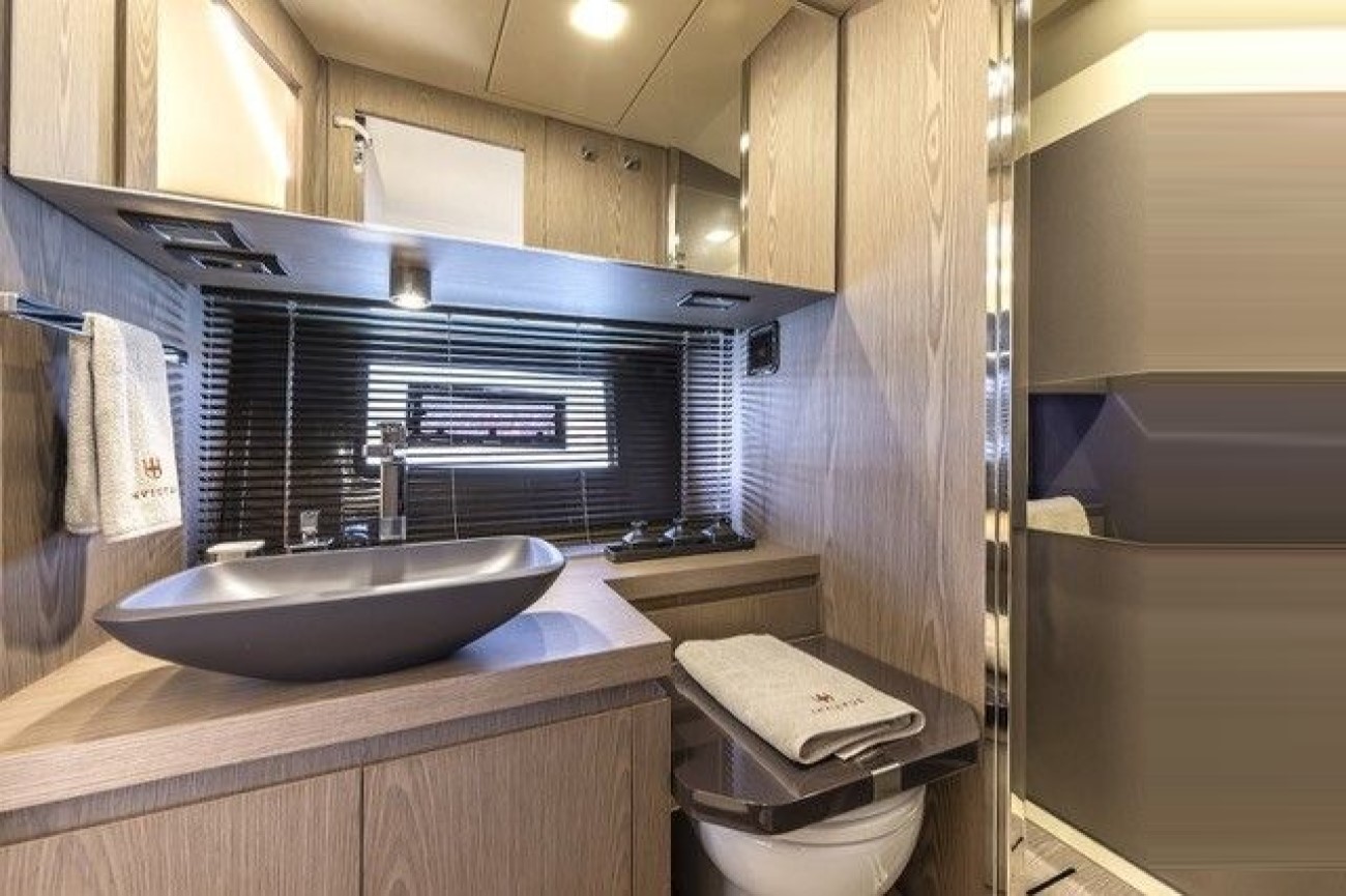 This yacht measures 14.27m and offers some of the most luxurious services. The motorboat equipment includes deck showers, bathing ladder, cockpit speakers, aft sundeck, and cockpit table. It also has some entertainment equipment such as WiFi, air conditioning, hot water, and beach towels. You also get access to a well-equipped kitchen that contains an oven, microwave, fridge, and coffee machine.