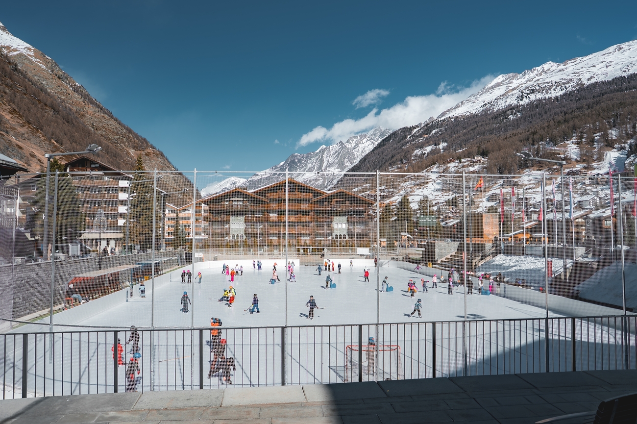 Right in the center of Zermatt, next to the Bahnhofstrasse, there’s an open-air rink that glows in the evening light. Ice skating here feels like stepping into a winter postcard. The rink sits against a backdrop of mountains, and the air smells faintly of pine and cocoa from nearby cafés.
