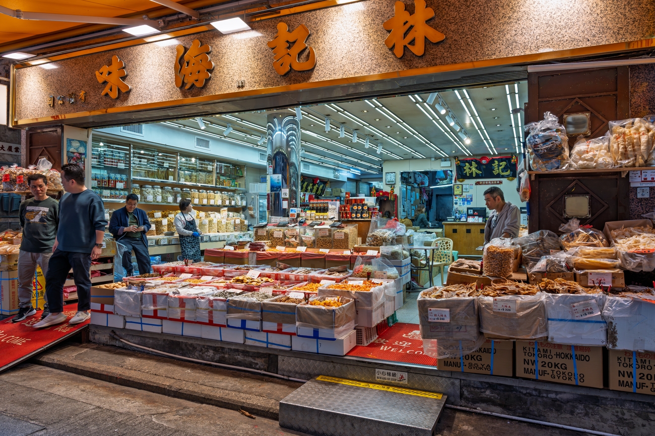 Des Voeux Road West, Wing Lok Street, and Bonham Strand West have formed the heart of Hong Kong’s dried seafood and traditional medicine trade since the mid-19th century. In the early 20th century, the area around Des Voeux Road West was known as the Salted Fish Compound, before the trade moved further upmarket and the streets became associated with what are now widely understood as Dried Seafood Street and Tonic Food Street. Today, more than 200 shops still line these blocks.