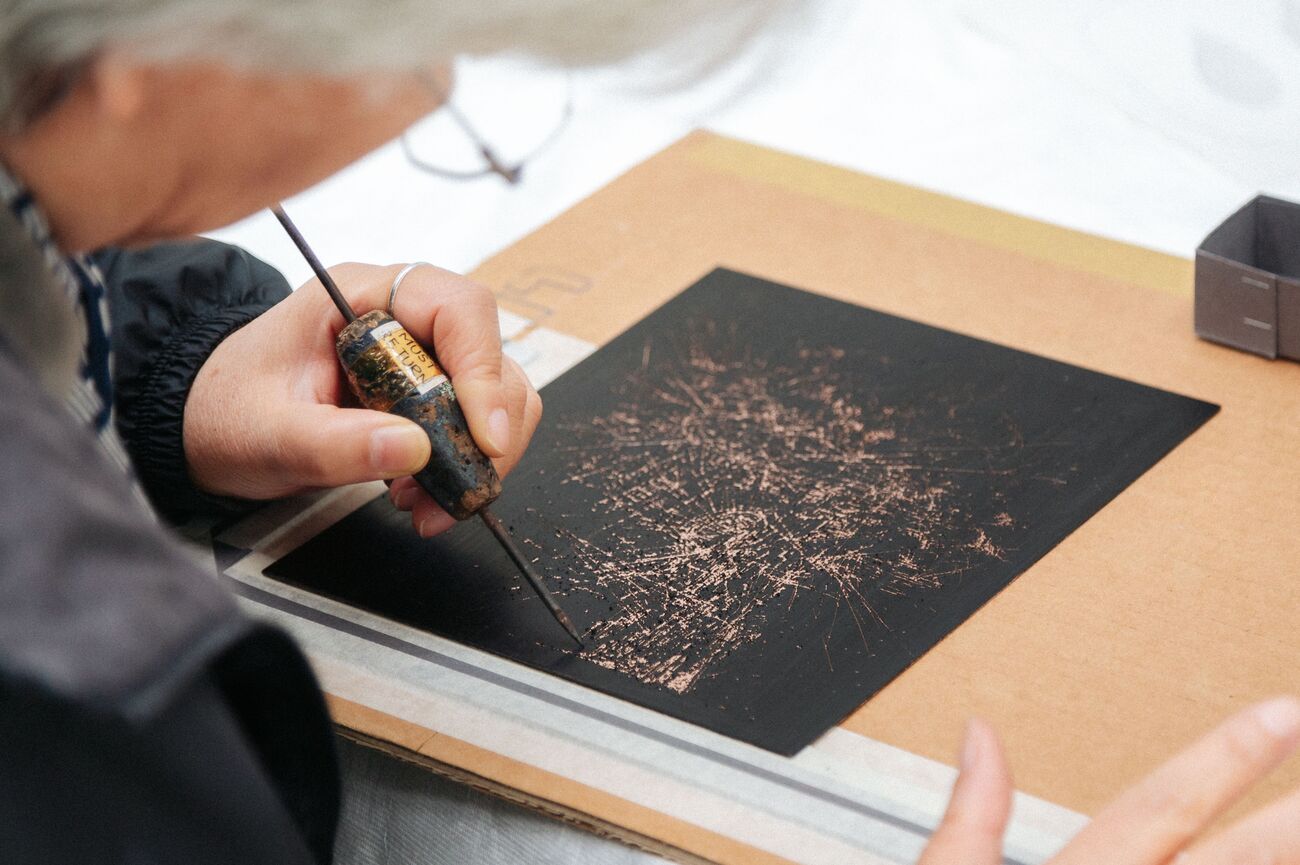 Admission to the gallery is free. From the gallery level, the studio remains visible, and on any given visit it is possible to watch an edition being produced on the same floor where finished works are on display.