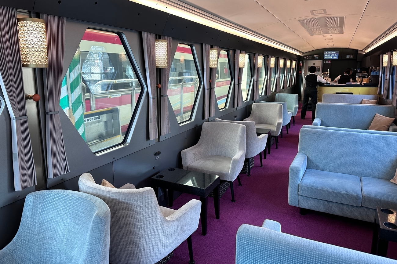 This lounge is designed like a classic resort hotel, with comfy sofas and chairs for solo travellers, couples, or small groups. It’s also where you’ll find the onboard GOEN café, so you can order drinks and snacks during the ride. If your train places this car at the front, you’ll enjoy wide, panoramic windows that let you see the tracks and scenery ahead, one of the most unique views on the entire Spacia X.