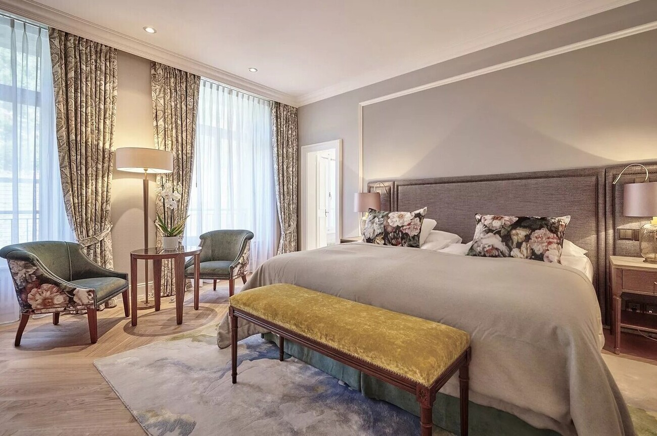 The property itself blends Belle Époque grandeur with modern comfort. High-ceilinged salons and sweeping staircases, accompanied with its marble accents recall its 19th-century heritage, while the 5,500-square-meter spa features an indoor pool, saunas and steam rooms. Rooms are spacious and elegantly furnished, many with direct mountain or garden views. Dining includes fine Swiss and Mediterranean cuisine, with wine lists that showcase both regional and international selections.