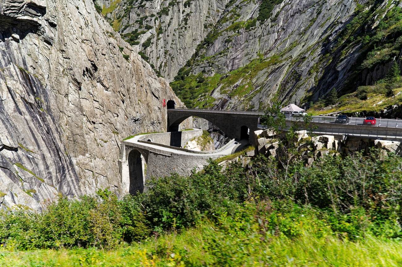 The first pause comes in Altdorf, the storied hometown of William Tell. In the shadow of the town’s frescoed tower, Gasthaus zum Kaiserstock welcomes you with its Alpine-modern menu; perhaps a plate of rösti crowned with local mountain cheese, or trout fresh from nearby lakes. From the terrace, the view opens toward the Reuss River, its water running fast and clear. Back on the road, the drive winds through the dramatic Schöllenen Gorge, where sheer granite walls rise on either side and the Devil’s Bridge spans the rush of white water below.