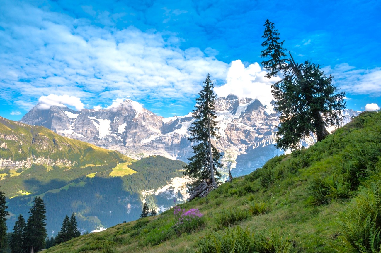 Best Hikes Switzerland: Train to Lauterbrunnen, visit Staubbach Falls, cable car to Grütschalp and train to Mürren, hike the Mürren Panorama Trail, lunch at Hotel Edelweiss Panorama Restaurant, optional visit to Gimmelwald, return to Interlaken for dinner at Restaurant Bebbis