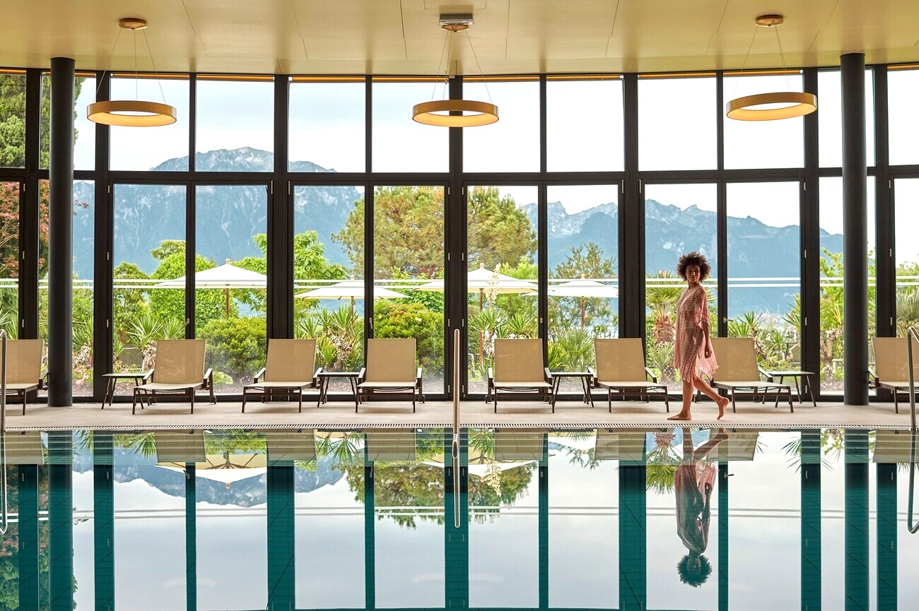Inside, the hotel is an ode to Swiss craftsmanship and French refinement. The rooms are grand but not overbearing; high ceilings, soft palettes, marble bathrooms, and wide terraces that open onto the lake. Some suites offer panoramic views that feel like private postcards. The Willow Stream Spa is one of the finest in the region, and the indoor/outdoor pools offer space to unwind between vineyard tours and lake cruises.