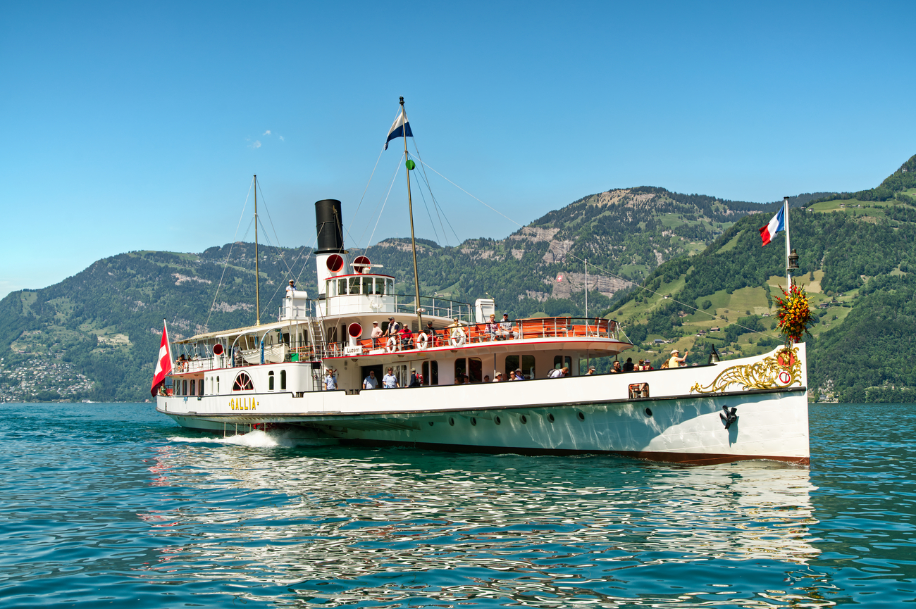 After the tasting, stroll toward the lake. The promenade begins near the KKL Luzern concert hall and follows the shoreline, passing willow trees and benches facing the water. You’ll see swans gliding in pairs and locals relaxing under the sun. If you’d like to continue on the water, step aboard one of the historic paddle steamers for a one-hour roundtrip cruise. The boat moves slowly across the surface, offering views of Mount Pilatus and the villas along the shore. Inside, the dining lounge has large windows, or you can stay on the open deck to feel the breeze and watch the city fade into the landscape.