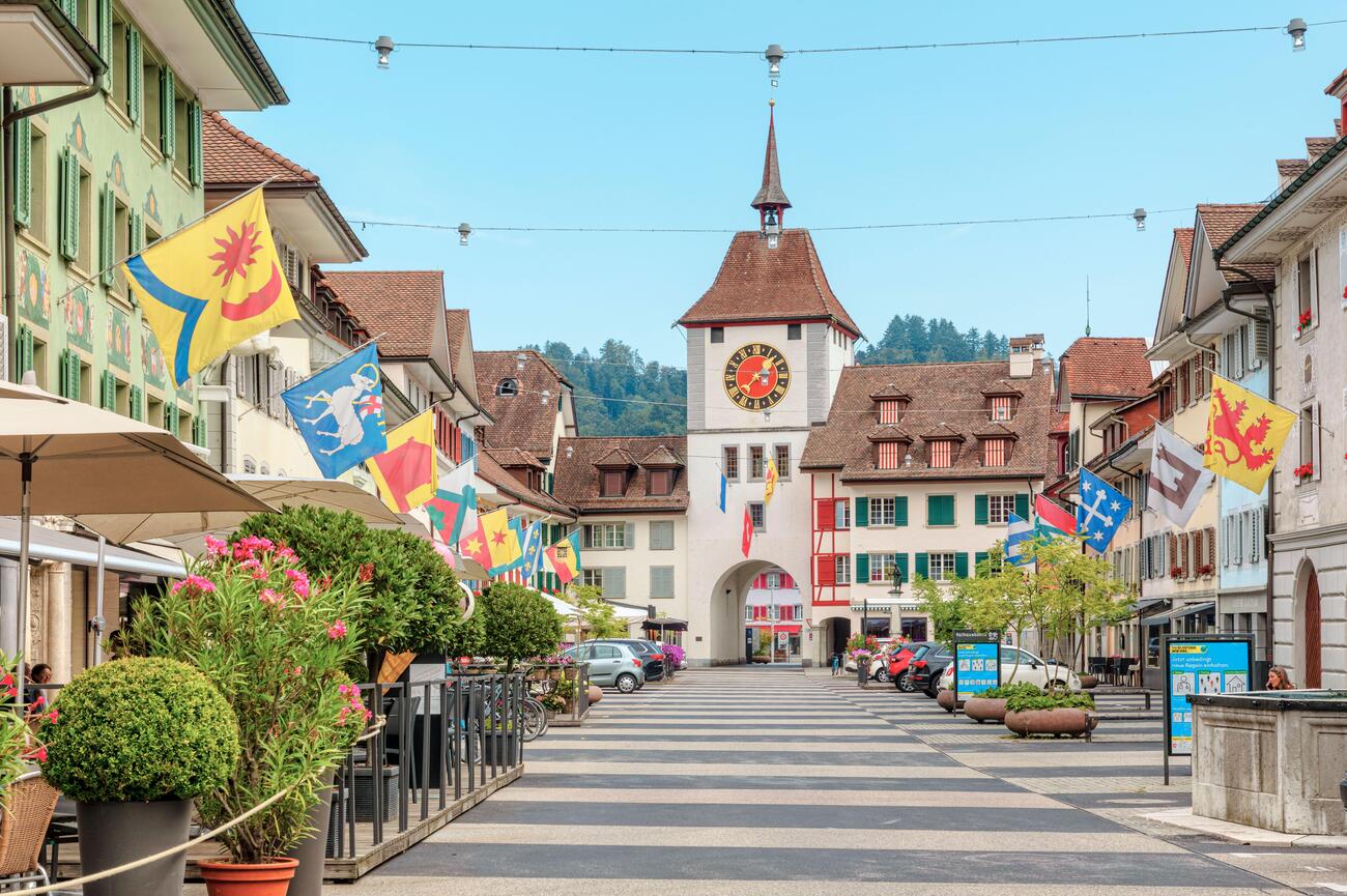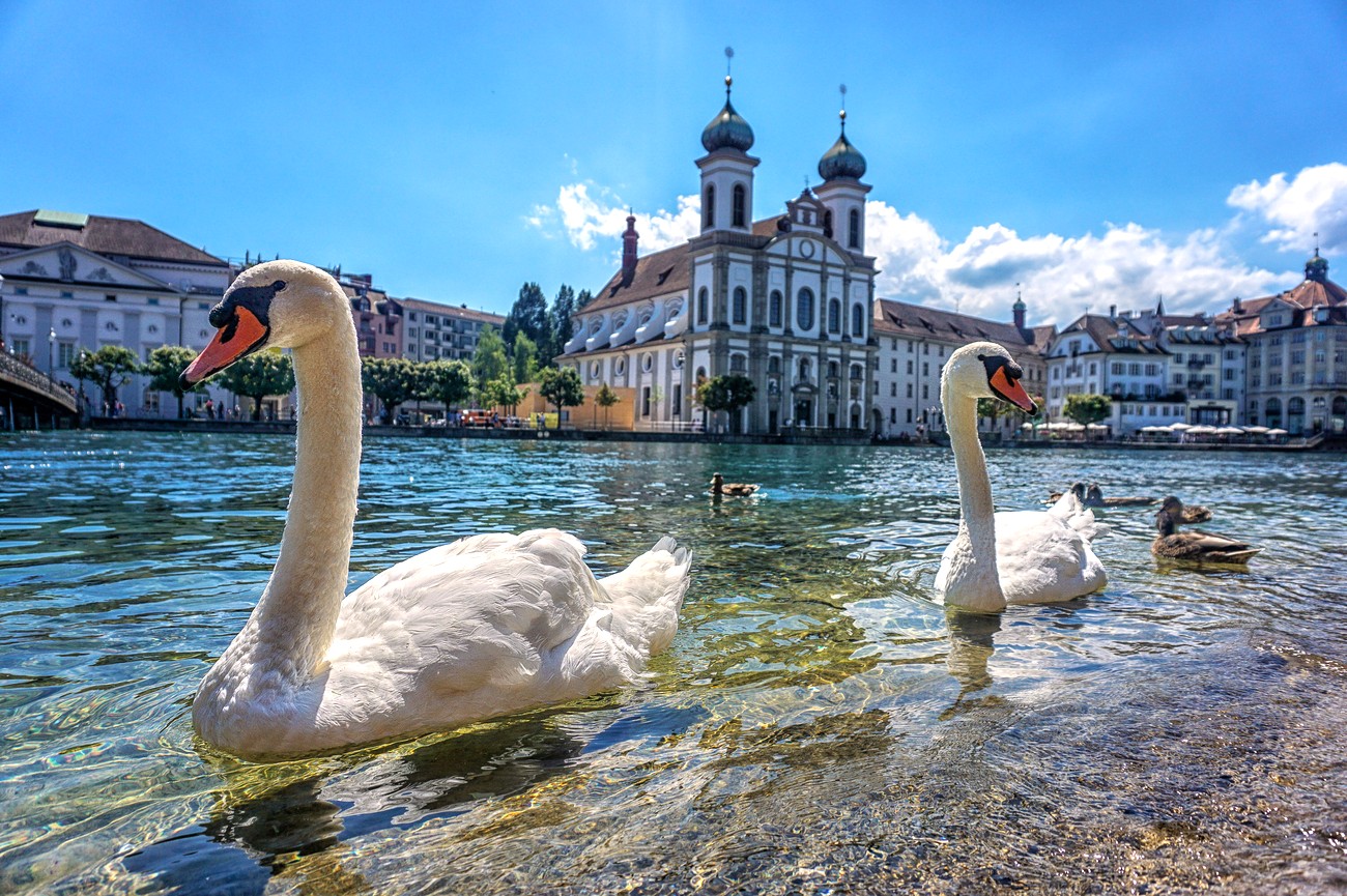Your suite is calm and bright, with high ceilings and tall windows facing the river. Swans drift across the current. Church bells ring somewhere in the distance. It’s quiet enough to hear both. After settling in, step outside to explore Lucerne’s Old Town. Take a scenic walk at The Chapel Bridge, a 14th-century wooden walkway lined with flower boxes and roof beams that are painted with scenes from the past. And just beyond is the Jesuit Church, its twin towers rising above the river. Inside, the baroque details and ceiling frescoes create a sense of hushed grandeur.