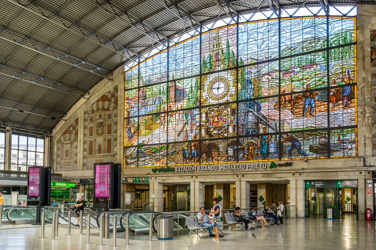 Incluso si no vas a coger ningún tren, merece la pena ir la estación de tren Abando en Bilbao para maravillarse con sus impresionantes vidrieras. El panel presenta temas relacionados con la historia y las costumbres de la ciudad, con referencias a la Basílica de Begoña y a la antigua industria siderúrgica y pesquera.