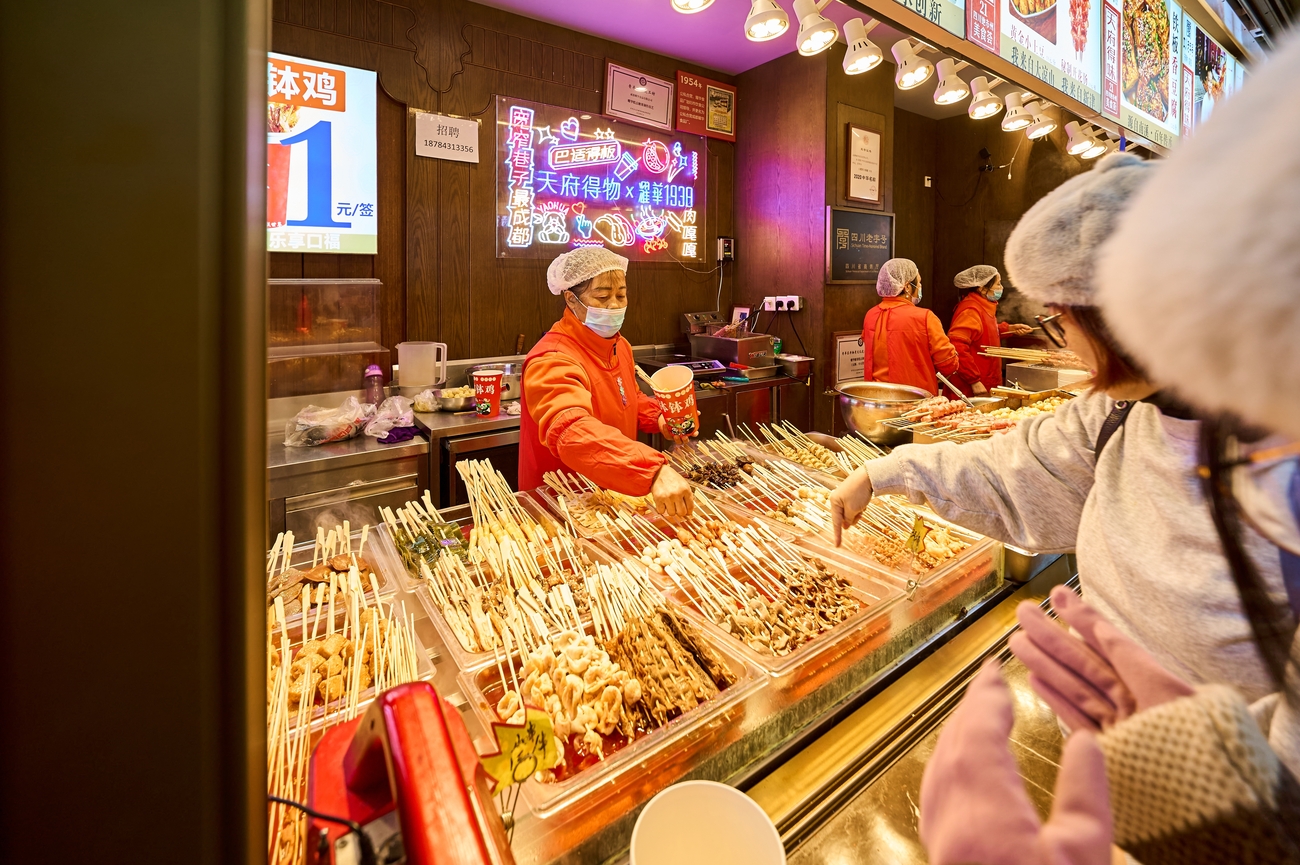 Si te gusta la comida callejera, este es el lugar al que debes venir con hambre. Pasea a tu ritmo y prueba favoritos locales como la ternera Zhang Fei, San Dapao (bolitas de arroz glutinoso), brochetas de pollo Bobo en salsa picante, tofu apestoso frito y fideos dulces en agua. Entre bocado y bocado, no pierdas de vista el escenario central de madera, donde hay actuaciones regulares de ópera de Sichuan, incluidos los famosos números de cambio de máscara y escupir fuego.