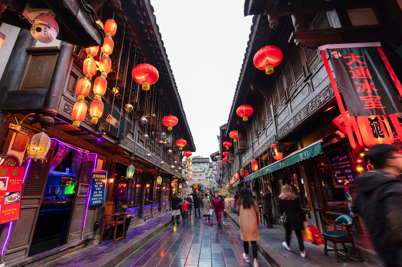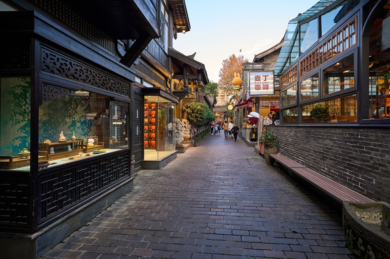 A pocos pasos del Templo Conmemorativo de Wuhou está la Calle Antigua Jinli, la famosa calle peatonal comercial de Chengdu. Construida con el estilo arquitectónico de finales de la dinastía Qing, este tramo de 550 metros suele llamarse la «Primera calle del Reino de Shu» y se siente como entrar en una escena del pasado.