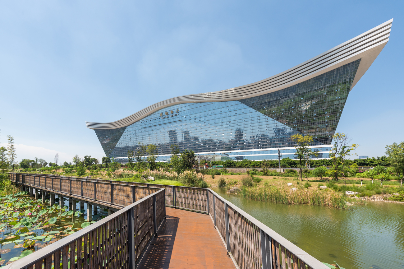 Entra en el New Century Global Center, uno de los edificios independientes más grandes del mundo, tan enorme que podría albergar alrededor de 20 Óperas de Sídney en su interior. Diseñado con una temática inspirada en el océano, se siente como una ciudad interior completamente autosuficiente, con un techo de cristal altísimo y un “sol” artificial que mantiene el espacio luminoso y agradable durante todo el año, así que el tiempo nunca será un problema para tu visita.