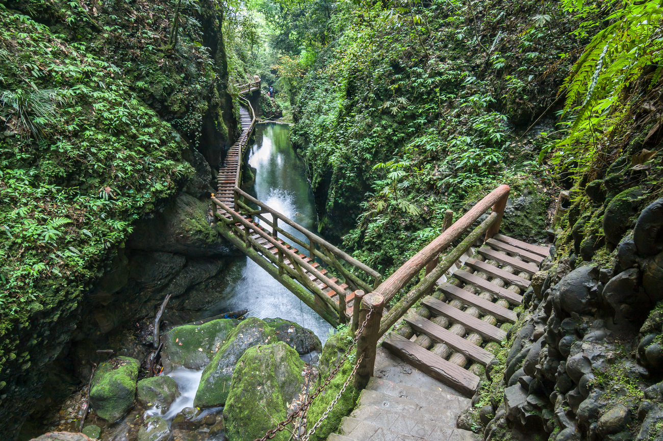 Si te apetece más naturaleza y aventura, la Montaña Trasera es la mejor opción. Aquí encontrarás cascadas, senderos entre bosques y paisajes de auténtico vértigo. Camina por la pasarela del desfiladero Longyin, explora el valle de Wulonggou con sus arroyos y saltos de agua, o entra en cuevas de cristal y de Buda llenas de formaciones rocosas naturales.