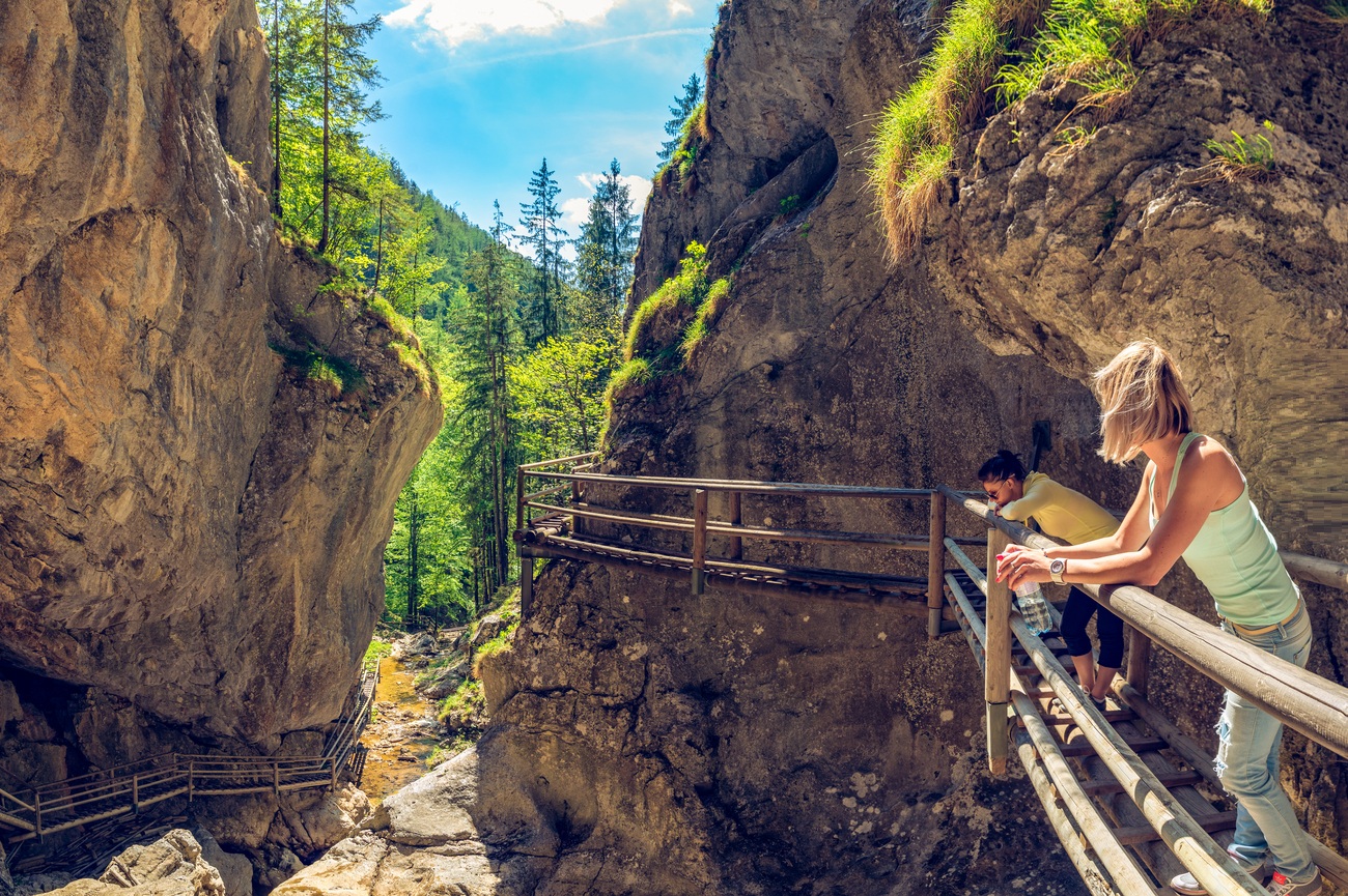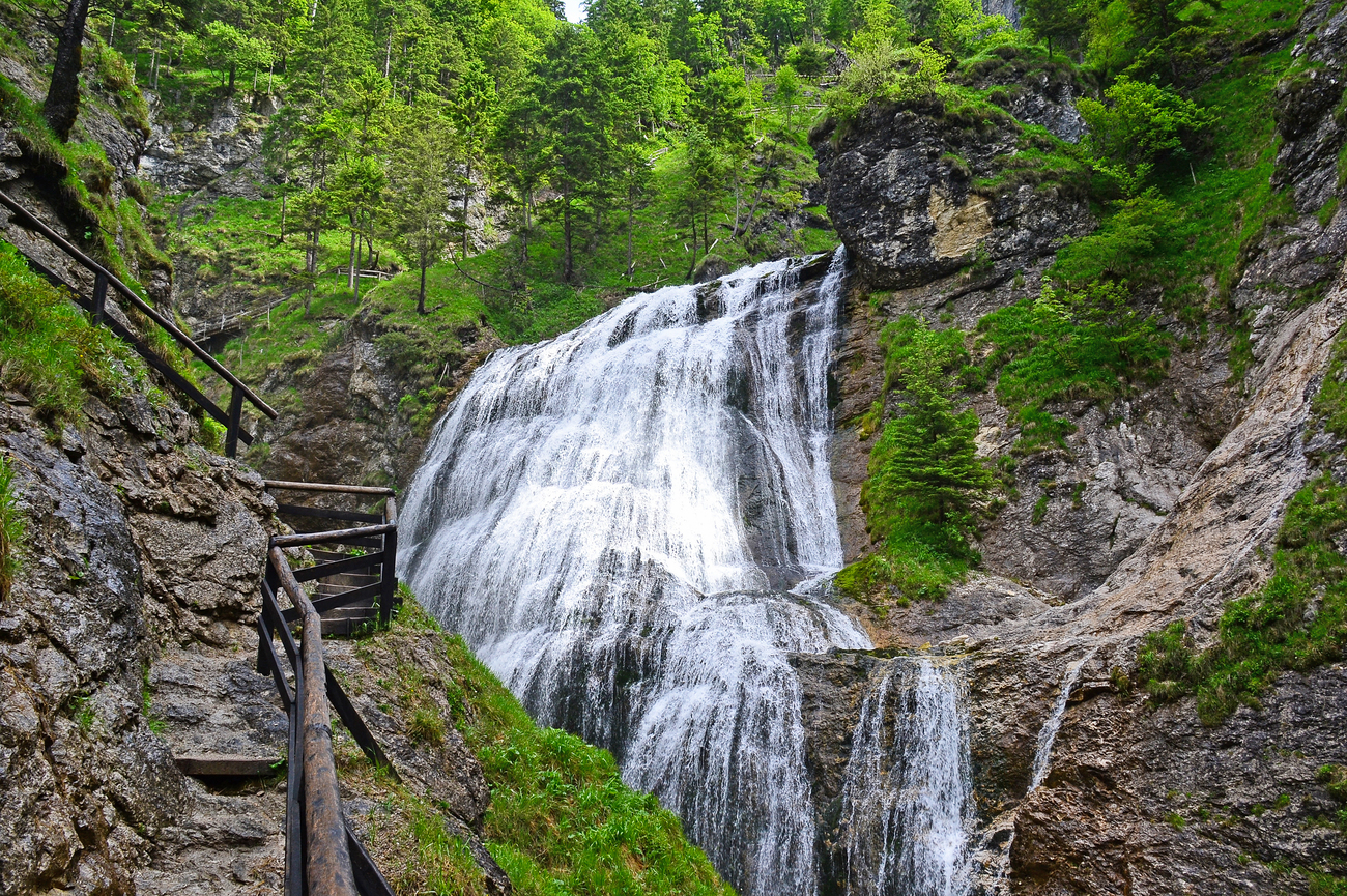 Desde la cueva Frauenmauerhöhle, un trayecto de unos 20 minutos por carreteras alpinas serpenteantes lleva hasta el desfiladero de Wasserlochklamm, cerca de Palfau. La transición de las cámaras subterráneas a las catedrales de roca al aire libre es puramente cinematográfica. En un instante hay silencio en penumbra, al siguiente agua impetuosa, acantilados bañados por el sol y un paisaje tan impactante que hace olvidar el paso del tiempo.