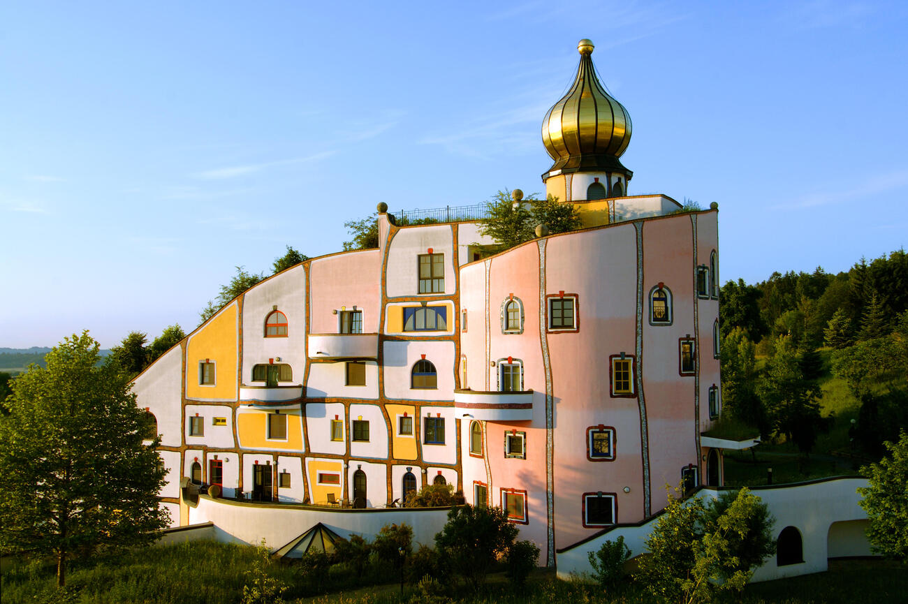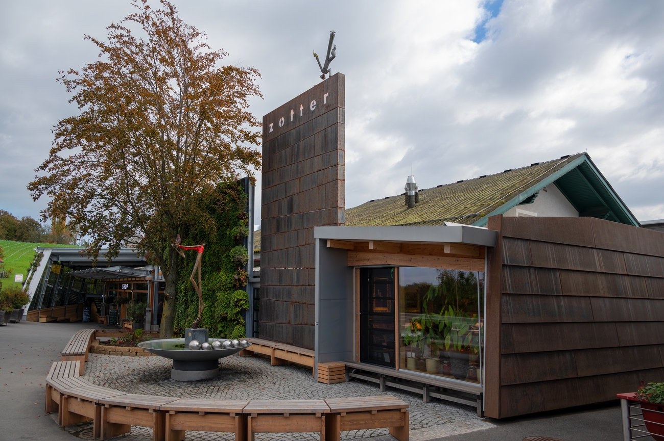 Desde las alturas volcánicas del Castillo de Riegersburg, el trayecto hacia el sur dura unos 25 minutos, atravesando colinas suaves, viñedos y caminos flanqueados por granjas, hasta que aparece el campus peculiar y colorido de Zotter Schokolade. La fábrica de chocolate y su centro de experiencias saltan literalmente a la vista con una arquitectura lúdica y un diseño moderno y sostenible.