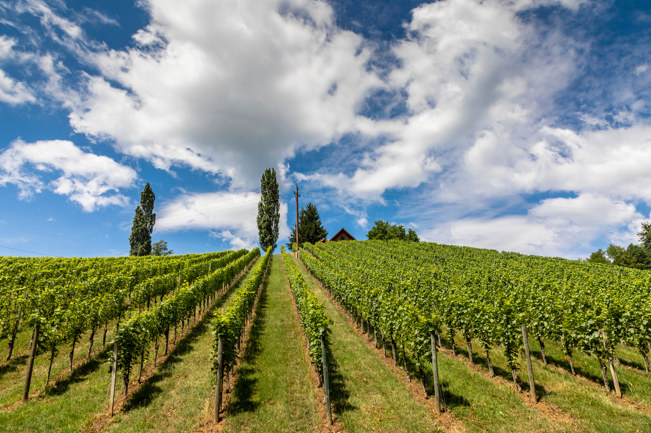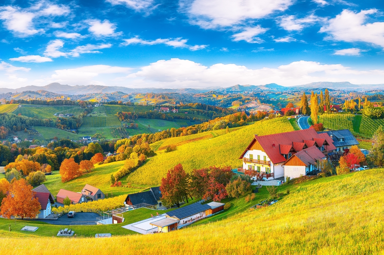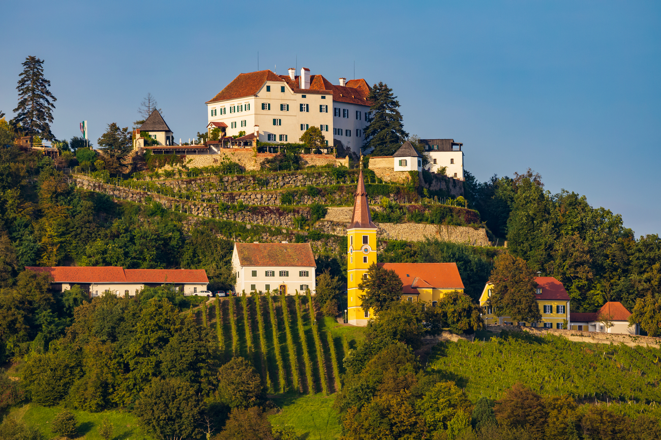 Dejando atrás la elegancia en lo alto de la colina de Schloss Seggau, la carretera serpentea hacia el oeste durante unos 15 minutos, atravesando viñedos bañados por el sol y suaves colinas de Estiria hasta que aparece el encantador pueblo de Gamlitz.