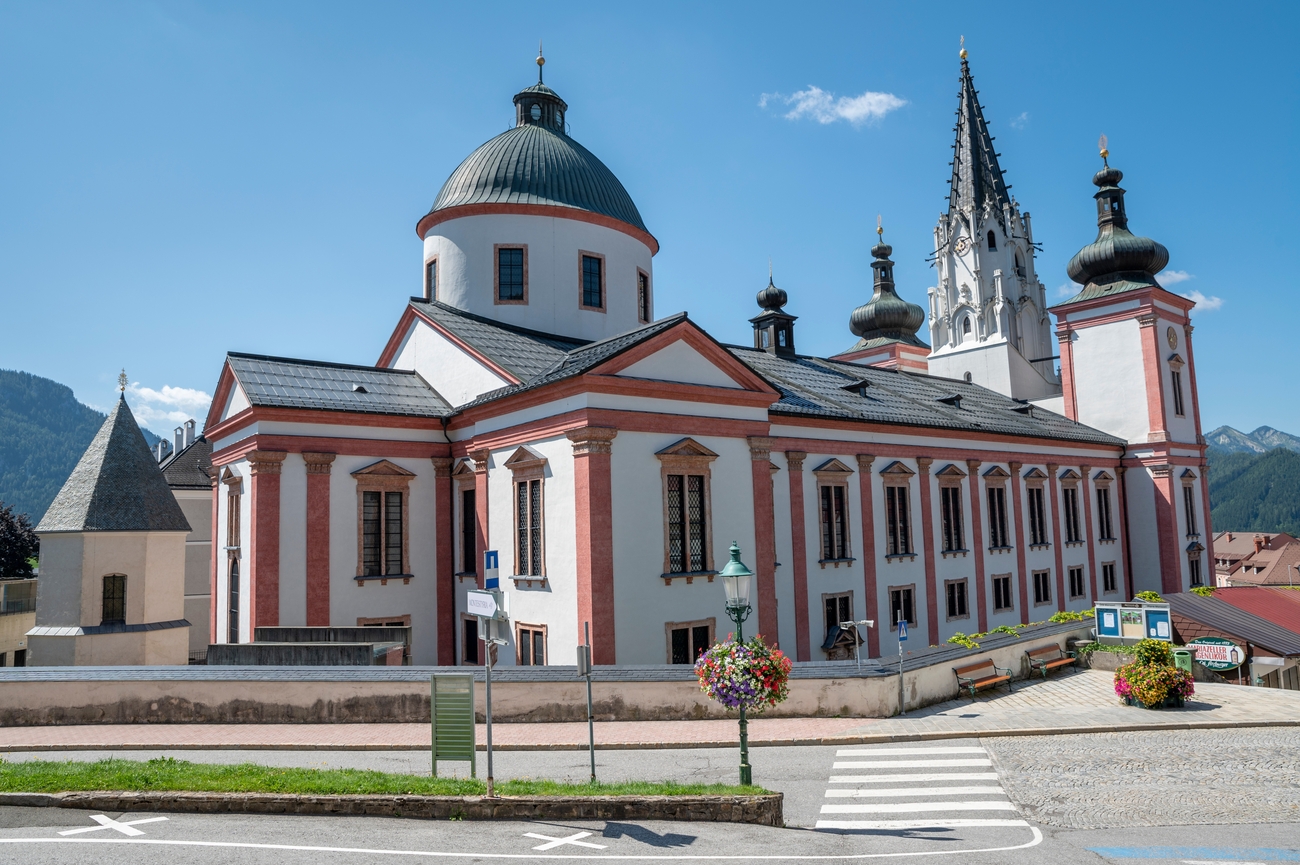 La Basilika Mariazell domina el skyline, con sus agujas barrocas y cúpulas de cobre elevándose con orgullo por encima del pueblo.