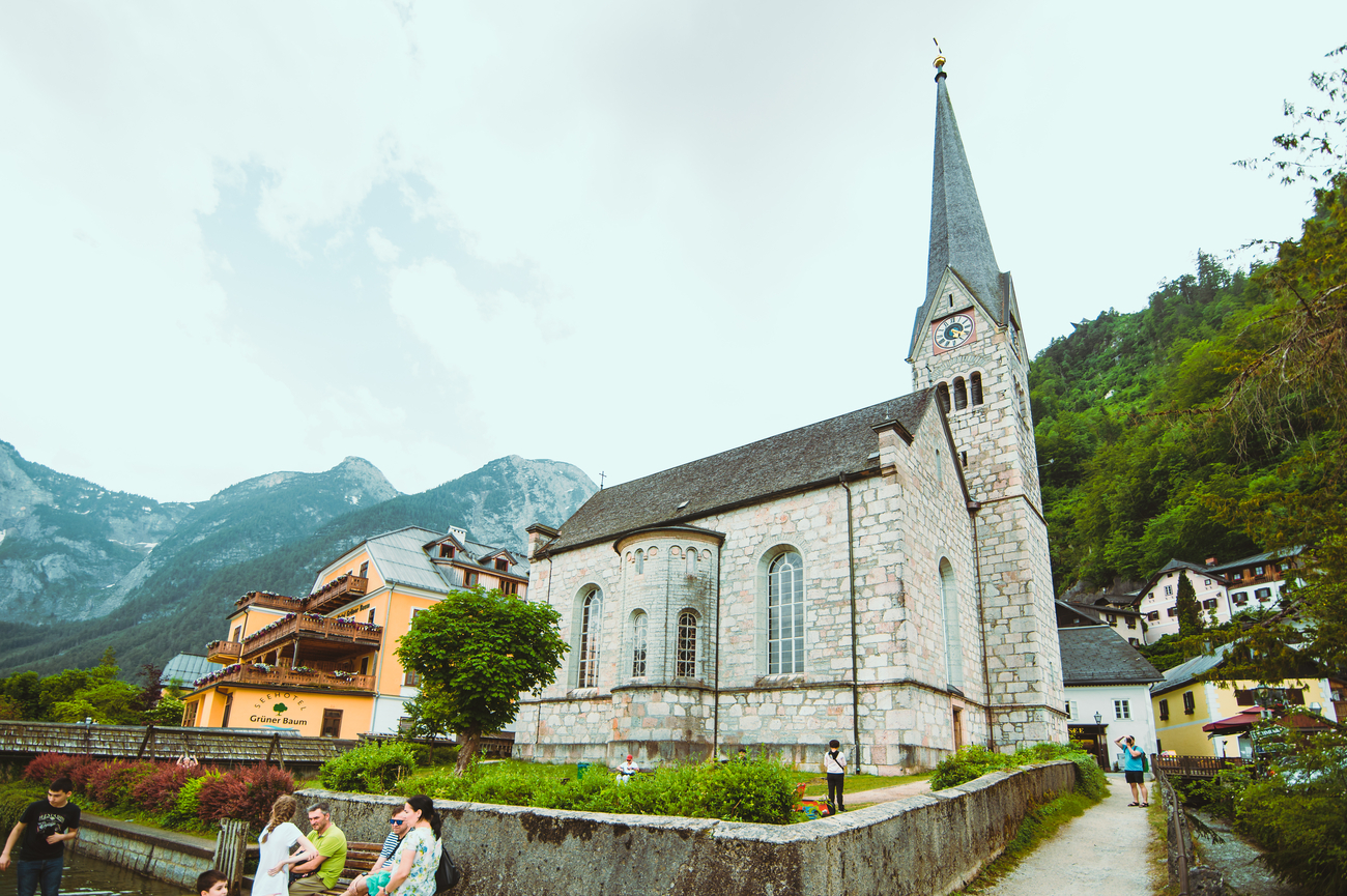 A unos minutos a pie desde el mirador clásico de Hallstatt llegarás a la Evangelische Pfarrkirche. No es una capilla escondida. Se alza alta y elegante, con una aguja que vigila en silencio los tejados alpinos y el lago a sus pies.