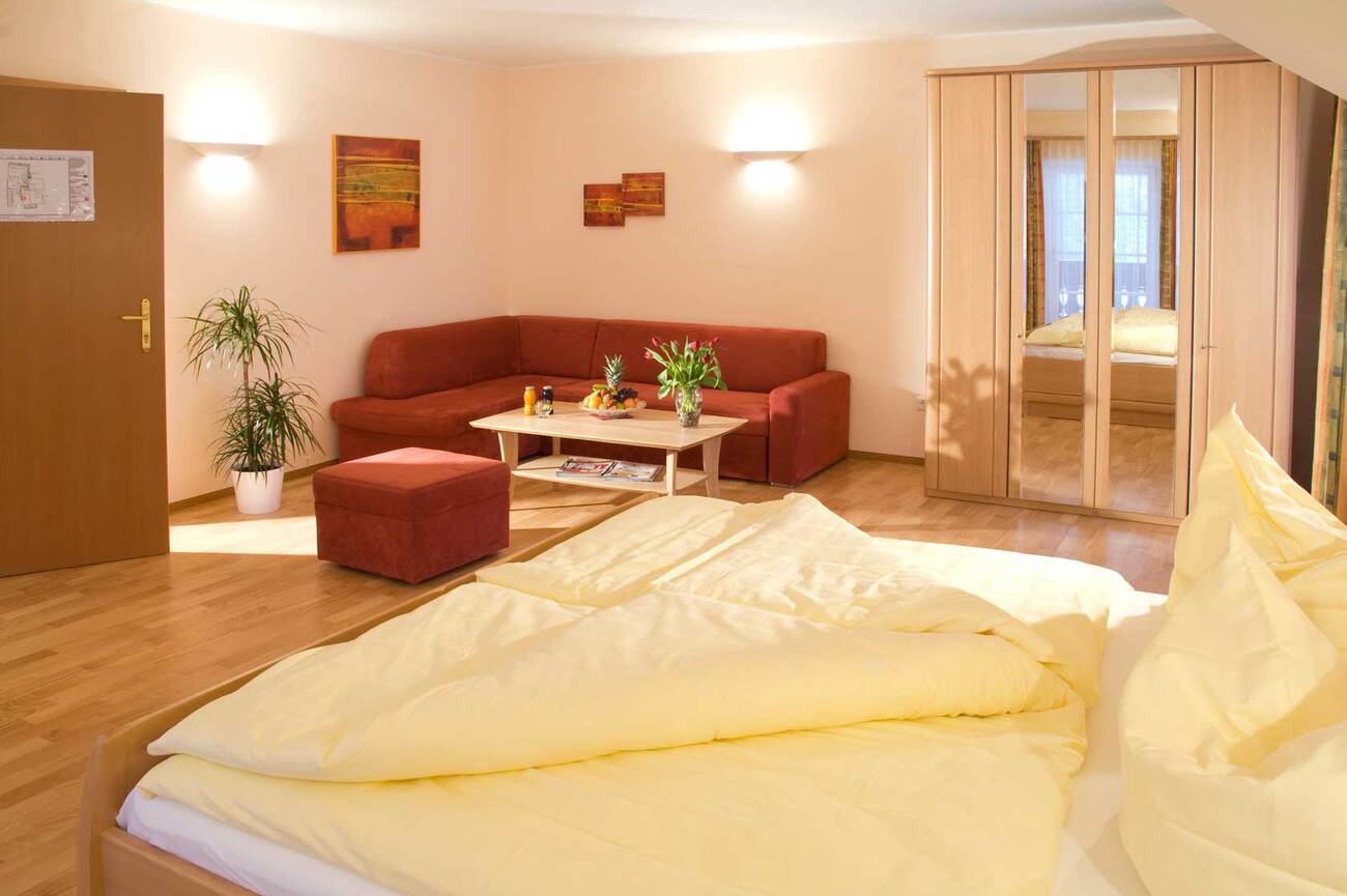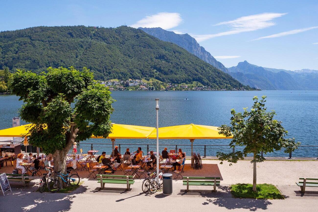 Un breve paseo de cinco minutos por las calles del pueblo te lleva directo al paseo marítimo de Lahn, donde el lago acaricia suavemente la orilla y los Alpes se alzan de forma dramática al fondo.