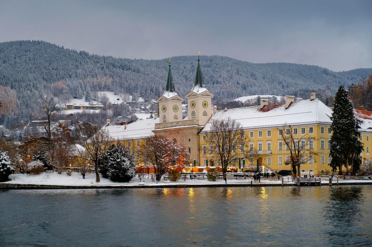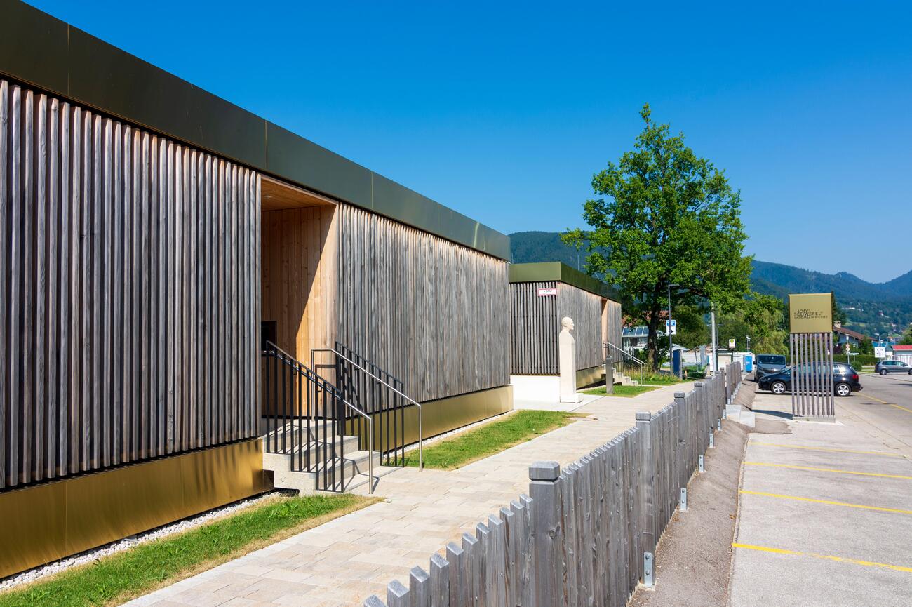 About 5 minutes on foot from Kloster Tegernsee, the scene subtly transforms. Cross the Kurpark toward the lakeside and the grand monastery backdrop gives way to a low, modern structure tucked among the trees.