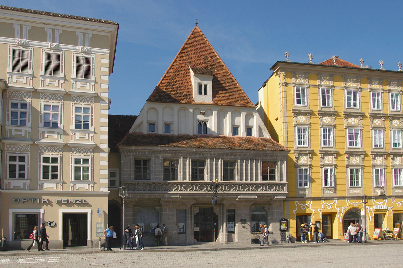 El Bummerlhaus es uno de los edificios residenciales más antiguos que se conservan en Austria, con origen en el siglo XIII, y no intenta ocultarlo. Su nombre proviene de una pequeña escultura de caracol fijada en la esquina, una señal de casa medieval de la época anterior a la existencia de números en las calles. En términos arquitectónicos, es la gran pieza gótica de Steyr. Arcos apuntados, ventanas con parteluz y tejados pronunciados hablan de una riqueza medieval seria y de una confianza a largo plazo. Esto nunca fue solo una casa. Fue una declaración de estatus tallada en piedra.