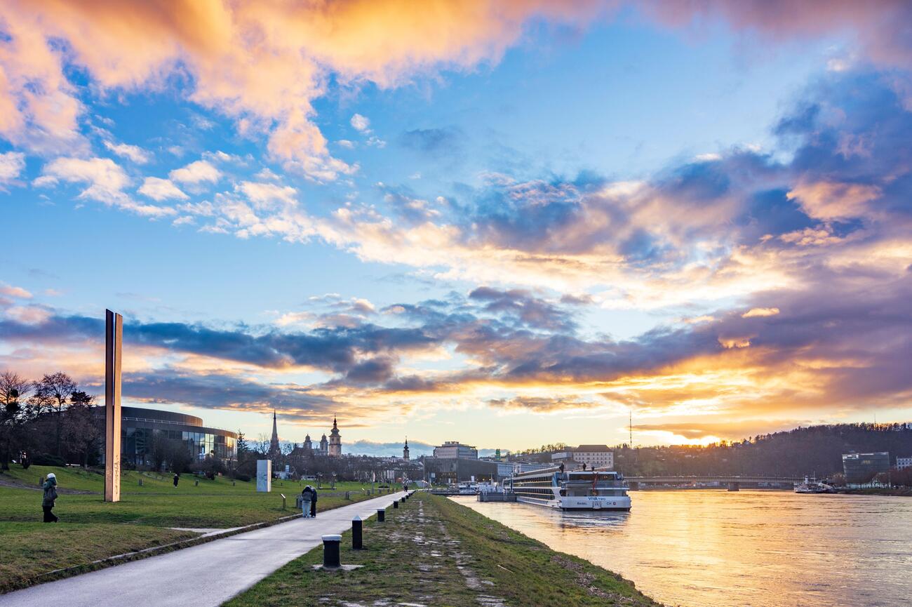 La ciudad recuerda de pronto que tiene un río que mostrar. Un paseo suave cuesta abajo hacia el Danubio, de unos diez minutos sin prisas, transforma el ambiente del silencio medieval a una seguridad contemporánea.