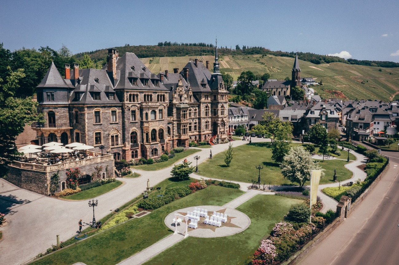 Marienburg Abbey rises above the Mosel like a closing spell. Once an Augustinian monastery founded in the 12th century, Marienburg sits high on a hill overlooking one of the river’s most dramatic bends. Even in partial ruin, the site feels composed with stone walls catching the last light and open grounds framing vast views.
