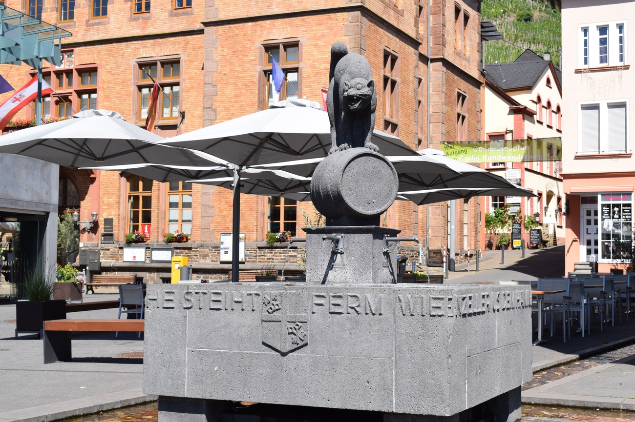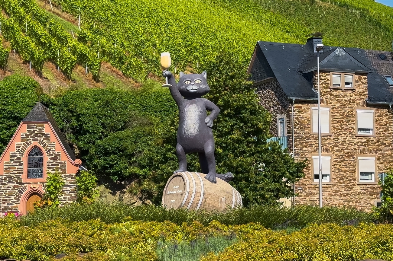 Zeller Schwarze Katz Fountain is Zell’s most famous wink. The fountain celebrates the legend of the “Black Cat of Zell,” a story that turned into one of the Mosel’s best-known wine names. According to local lore, a black cat once guarded a barrel of especially good wine so fiercely that merchants knew it had to be the best of the lot. The name stuck and so did the reputation.