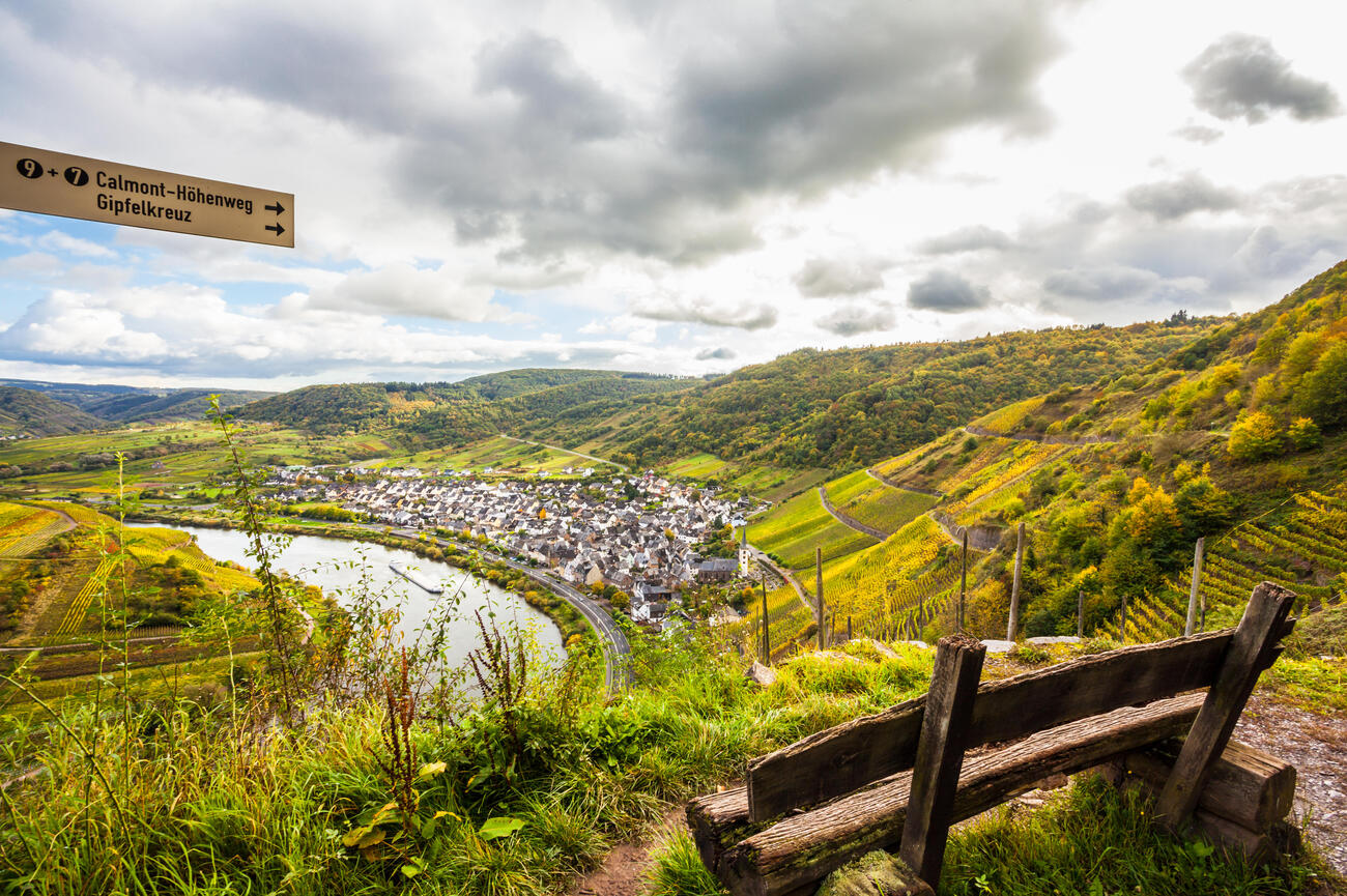 Moselschleife Bremm Aussichtspunkt delivers one of the Mosel’s most iconic perspectives. From here, the river completes a near-perfect loop around the village of Bremm, wrapping the steep Calmont slopes in a sweeping curve that feels almost deliberate. You’re high enough to see the full geometry: the vineyard’s sharp incline, the river’s patience and the way the village sits calmly at the center of it all.