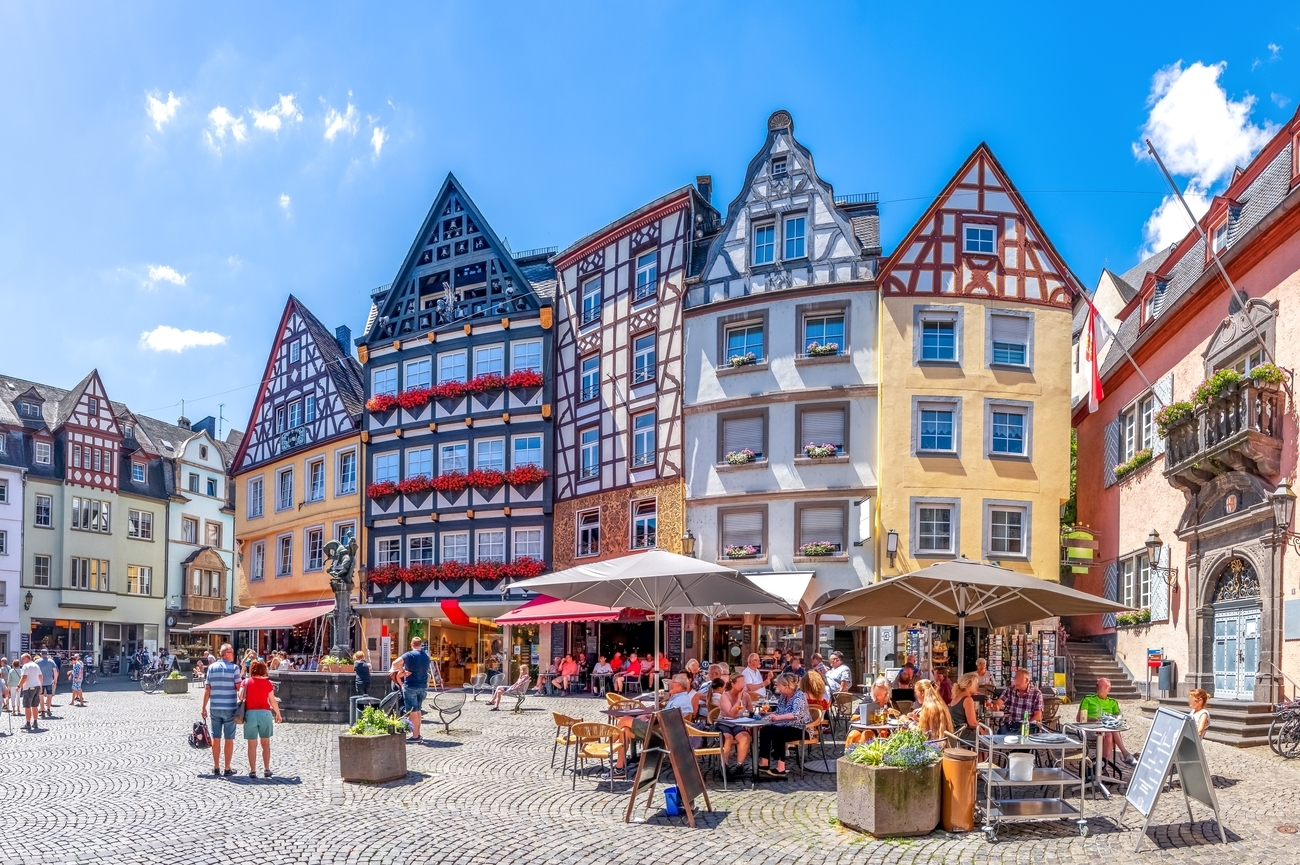 Cochem Market Square is where Cochem softens. Framed by half-timbered houses, pastel facades and narrow streets that seem to lead everywhere at once, the square feels intimate rather than grand. Historically, this has long been Cochem’s civic heart, a place for trade, announcements and daily encounters shaped by river life and wine commerce. The surrounding buildings reflect late medieval and early modern styles, scaled for people rather than spectacle. You’ll notice how close everything feels: cafes tucked into corners, shopfronts opening directly onto the square and conversations overlapping naturally.