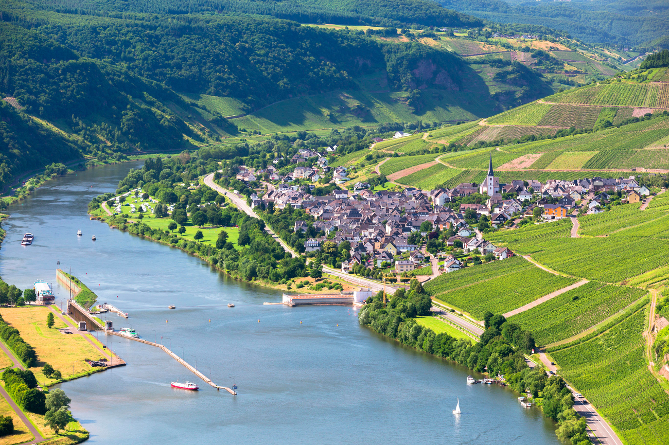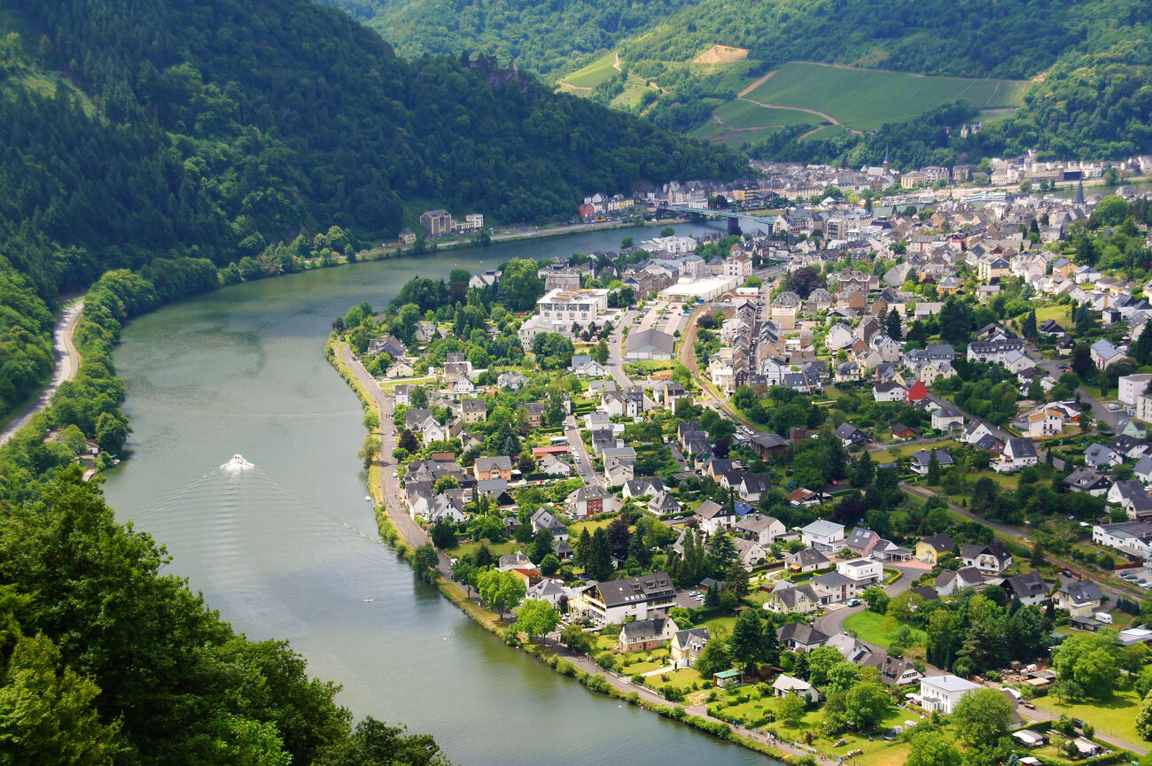 From Wehlener Sonnenuhr, you stay loyal to the river. Just a 15–20 minute glide along the Mosel, where the valley opens up and the light starts doing most of the talking.