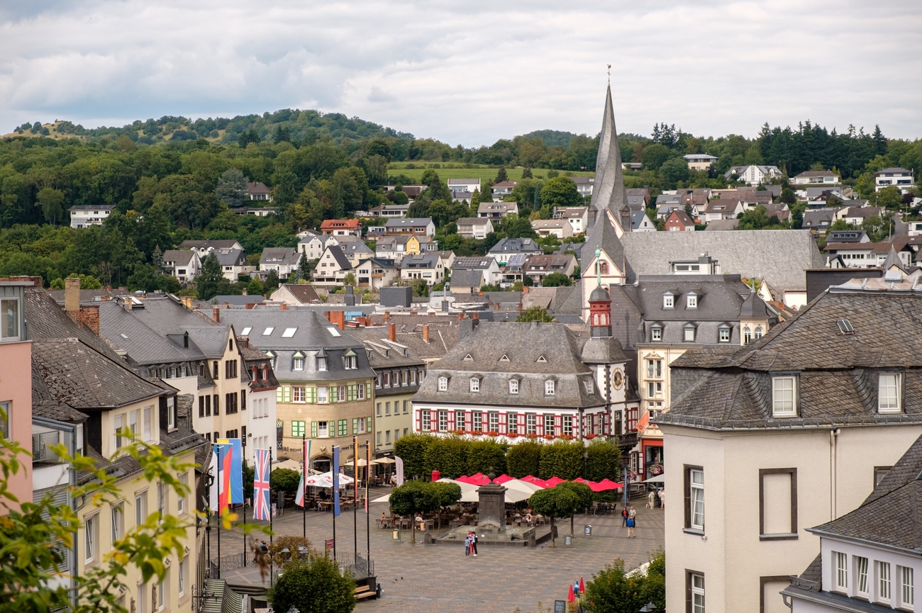 Marktplatz has been Bernkastel’s civic and commercial center since the Middle Ages, shaped largely by the wine trade along the Mosel River. You’re standing where merchants once negotiated barrels, prices and passage along the river routes that made the town prosperous. At the center rises St. Michael’s Fountain. Many of the surrounding buildings date back to the 15th and 16th centuries, with visible timber framing, slate roofs and narrow proportions that reflect medieval town planning. Look closely and you’ll notice inscriptions, carved beams and asymmetrical lines with details that reward attention and make every angle feel personal.