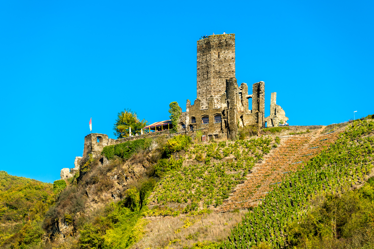 Burgruine Starkenburg sits above the valley with a quieter, more exposed presence than the ruins closer to town. Founded in the 11th century by the Prince-Archbishops of Trier, it was built to watch, to control, and to signal authority over the river corridor below. Much has been lost to time and conflict, but what remains still reads as defensive architecture, thick stonework, high positions, and fragments that hold their ground against wind and weather.