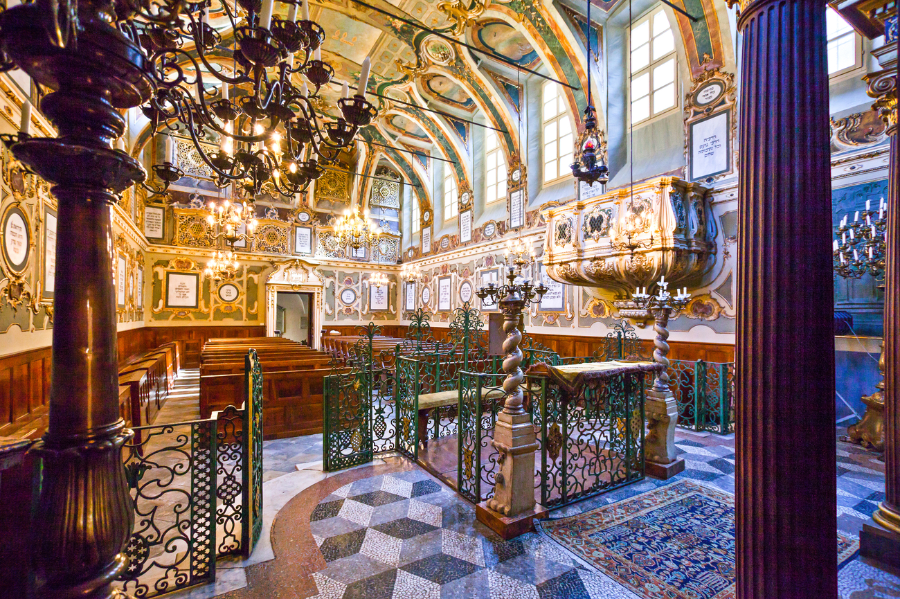 Érigée en 1595, la synagogue est une véritable leçon d’équilibre entre sobriété et splendeur. Stucs finement travaillés, dorures, plafonds peints à la main et lustres délicats emplissent l’espace d’une opulence feutrée. C’est l’une des plus anciennes et des plus belles synagogues d’Italie, et elle porte son histoire avec une élégance silencieuse plutôt qu’avec ostentation.