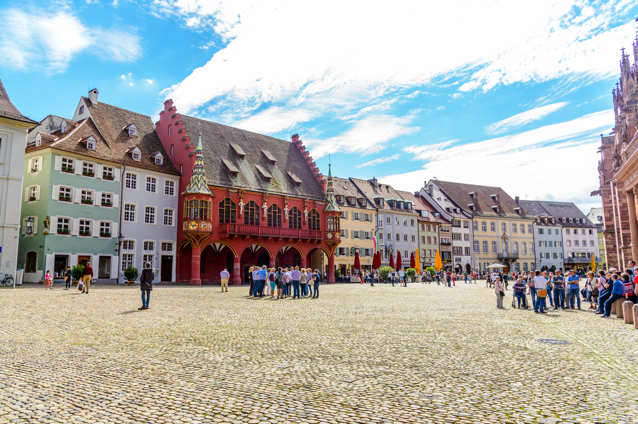 Münsterplatz has been Freiburg’s social and commercial heart for centuries. Colorful townhouses with sloped roofs and decorative details line the perimeter, including the striking red Historisches Kaufhaus on the south side. On most mornings (except Sundays), the square hosts Freiburg’s famous farmers’ market where regional vendors sell fresh produce, flowers, cheeses, breads and Black Forest specialties.