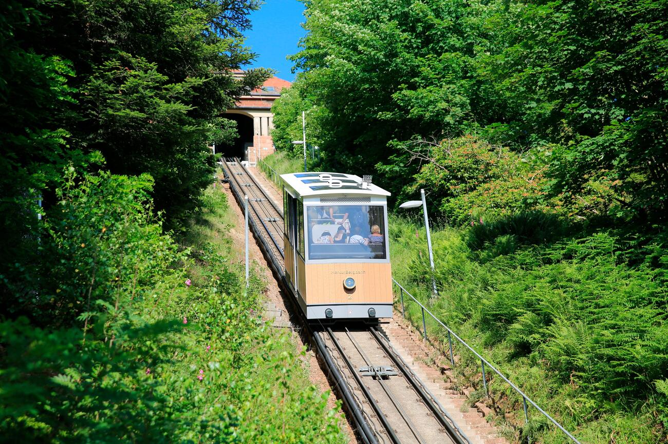 The Merkurbergbahn has been carrying visitors up Mount Merkur (668 meters above sea level) since 1913. It’s one of the longest and steepest funicular railways in Germany, climbing at a gradient that definitely earns your respect. The cars are modern and glass-fronted, so you’re getting uninterrupted views the whole way up. At the summit, panoramic platforms open up to sweeping forest canopies, the Rhine Valley, and on clear days, even the Vosges Mountains in France. There’s also a viewing tower at the top if you want that extra altitude flex.