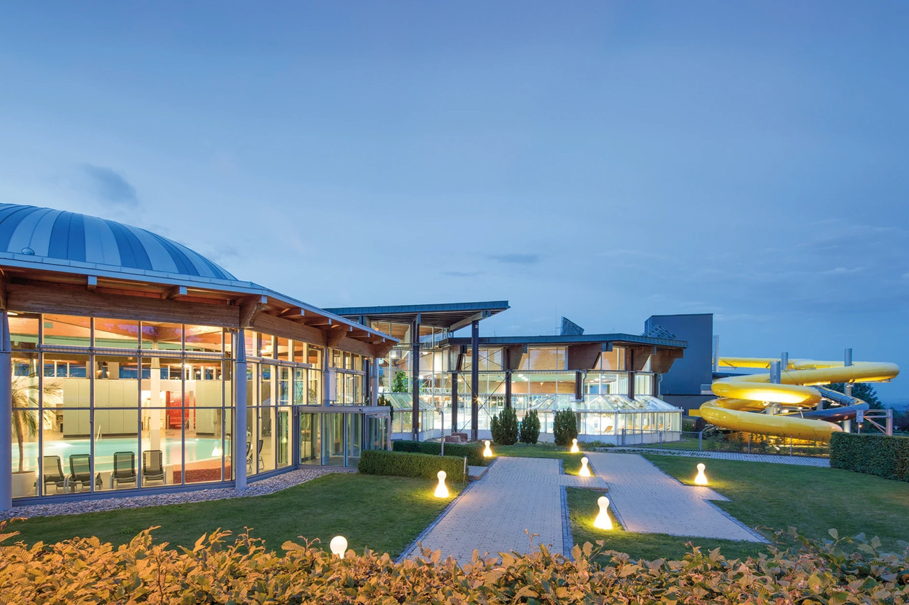 From the Titisee promenade, it’s just a 5-minute drive to Badeparadies Schwarzwald, home to the adults-only Palais Vital spa area. As you leave the lakeside bustle, the palm-tree-lined glass dome of the complex comes into view.