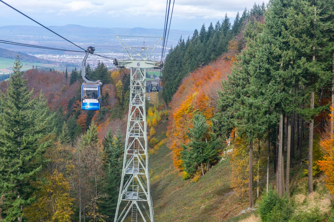 The Schauinslandbahn is Germany’s longest loop cable car, stretching about 3.6 kilometers to the summit of Mount Schauinsland (1,284 meters). The ride takes around 20 minutes, rising smoothly over forest clearings and rolling hills. Freiburg shrinks beneath you, the Rhine Valley opens outward and on clear days, you can see as far as the Vosges in France, sometimes even the distant Swiss Alps.