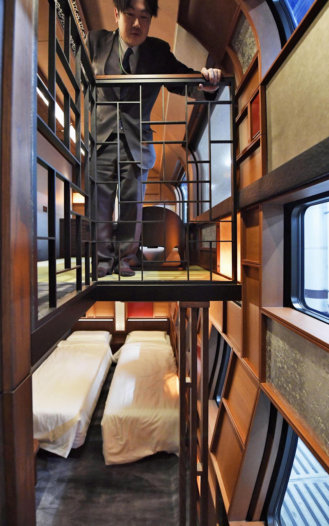 Ce sont les hébergements les plus exclusifs à bord, car il n’existe que deux Suites Shiki-shima, chacune occupant un angle de la voiture n° 7. Elles présentent un aménagement en duplex avec une chambre et un salon séparé, ainsi qu’une salle de bain privée équipée d’une baignoire en bois de cyprès. La suite dispose de larges baies vitrées encadrant la campagne comme un tableau en mouvement, d’un sol de style tatami, de cloisons en washi et d’œuvres d’art soigneusement sélectionnées. C’est, en somme, un ryokan privé sur rails.